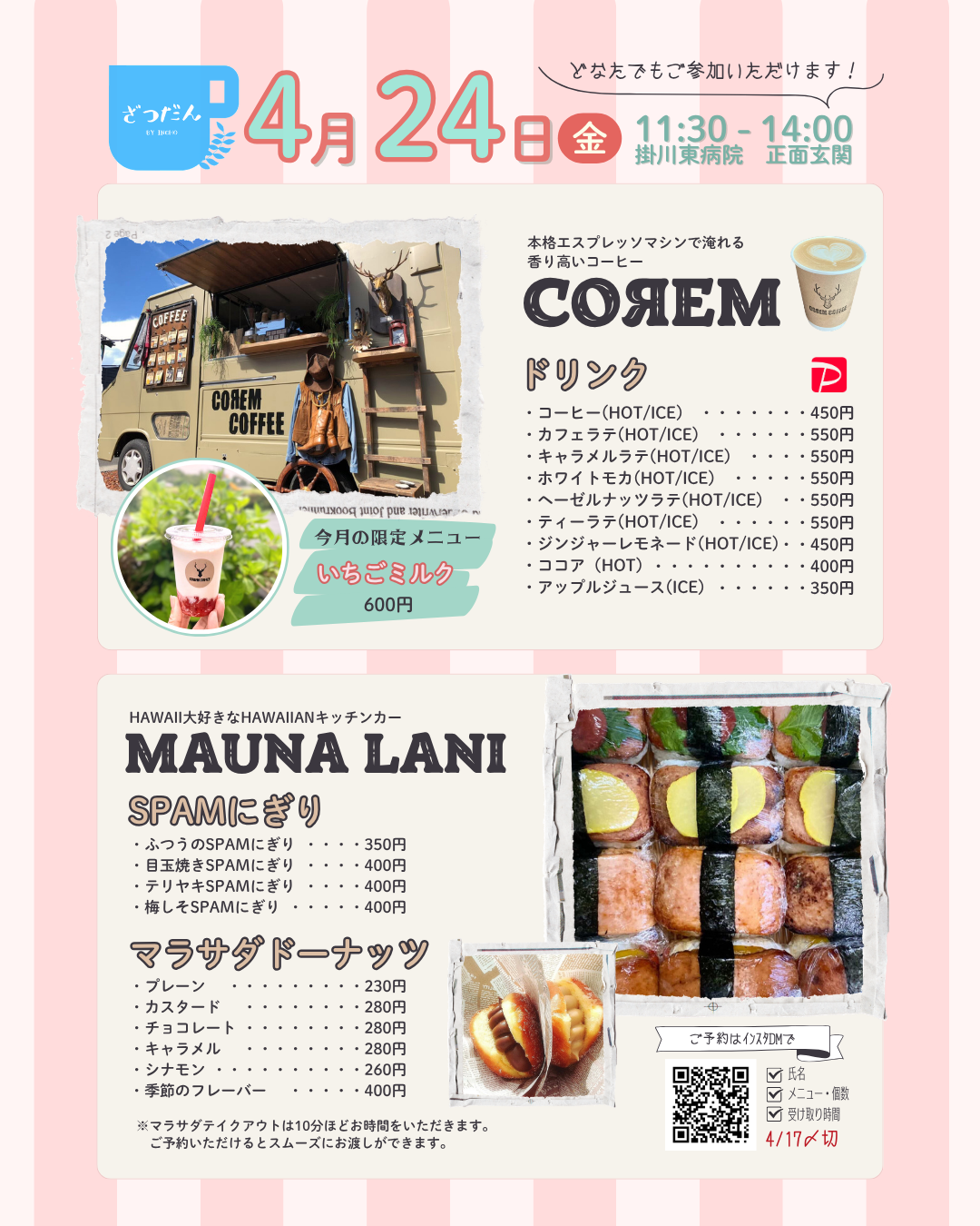 毎月1回、キッチンカーや店舗に来院していただき、当院正面玄関にて販売を行っています。